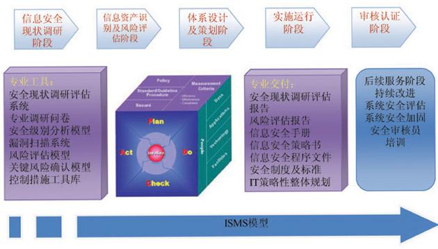 ISMS模型将整个信息安全管理体系建设项目划分成五个大的阶段,并包含25项关键的活动,如果每项前后关联的活动都能很好地完成,最终就能建立起有效的ISMS,实现信息安全建设整体蓝图,接受ISO27001审核并获得认证更是水到渠成的事情。